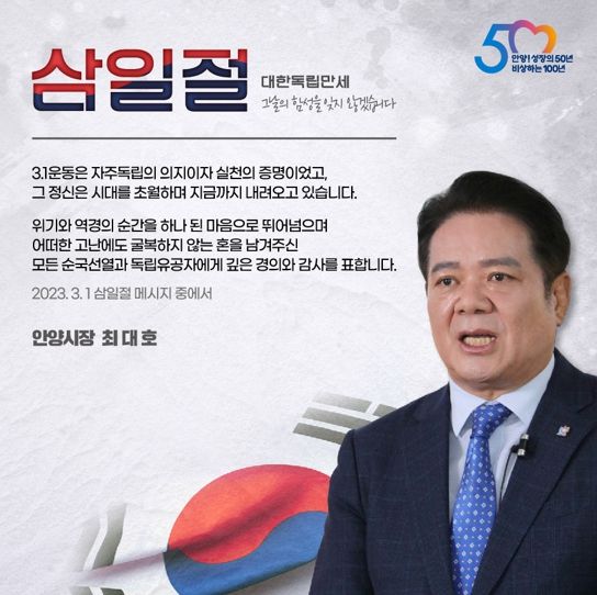 [경기탑뉴스=박봉석 기자] 최대호 안양시장이 제104주년 삼일절을 맞아 3·1 운동의 시대정신을 계승해 위기를 극복하자는 메시지를 시민들에게 전했다.