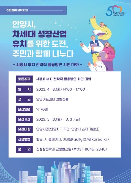 참여 대상은 안양시민과 안양시 소재 기업인이며, 이달 13일부터 31일까지 참여 신청을 받아 약 70명을 회의 참여자로 선정한다.