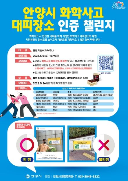 [경기탑뉴스=박봉석 기자] 안양시가 10일부터 다음달 19일까지 ‘화학사고 대피장소 인증 챌린지’를 진행한다.