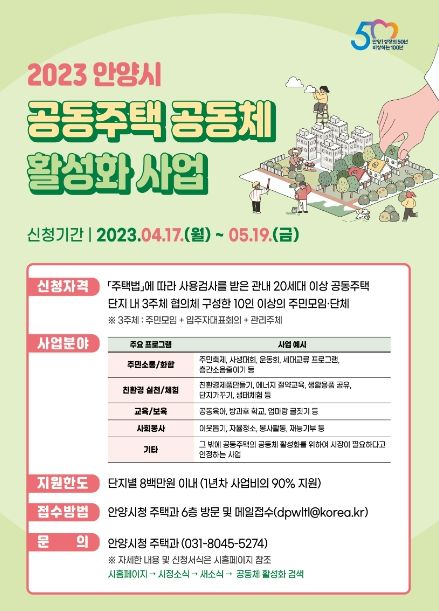 [경기탑뉴스=박봉석 기자] 안양시가 아파트 등 공동주택의 이웃 간 소통 확대와 살기 좋은 주거문화를 조성하기 위한 ‘2023년 공동주택 공동체 활성화 지원사업’에 참여할 공동주택 단지를 모집한다고 25일 밝혔다.