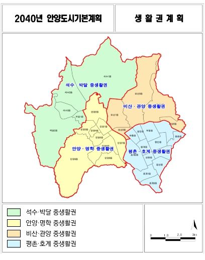시 전체를 4개의 생활권(석수·박달, 안양·명학, 비산·관양, 평촌·호계)으로 구분하고 기반시설 및 편의시설 등을 균형적으로 배치해 시민들의 불편을 최소화하고 생활권별 특성화 사업 발굴을 통한 지역활성화 및 균형발전을 이끌어 낼 계획이다.