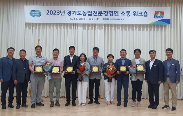 [경기탑뉴스=박봉석 기자] 경기도농업기술원이 20일 ‘2023년 경기도농업전문경영인 소통 워크숍’을 열어 올해 경기도농업전문경영인 6명을 선정하고 경기도지사 인증패와 인증현판을 수여했다.