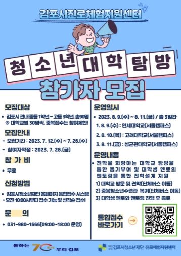 [경기탑뉴스=한진선 기자] (재)김포시청소년재단(대표이사 심상연) 진로체험지원센터는 관내 청소년들에게 대학입시에 대한 현실적인 진학설계를 지원하고 ‘진학’에 대한 동기부여를 위한 ‘청소년 대학 탐방 사업’을 운영한다. 중등 1학년부터 고등 3학년을 대상으로 총 90명을 모집하여 3회기로 나누어서 운영할 예정이라고 센터는 밝혔다.