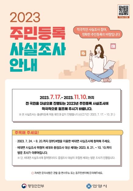 [경기탑뉴스=박봉석 기자] 안양시는 전 시민을 대상으로 오는 11월 10일까지 주민등록지와 실거주지 일치 여부를 조사하는 ‘2023년 주민등록 사실조사’를 실시한다고 26일 밝혔다.