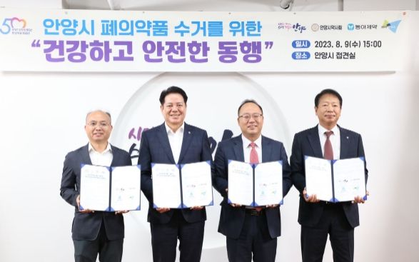 [경기탑뉴스=박봉석 기자] 안양시는 9일 오후 3시 시청 접견실에서 동아제약, 용마로지스, 안양시약사회와 ‘폐의약품 수거를 위한 업무협약’을 체결했다.