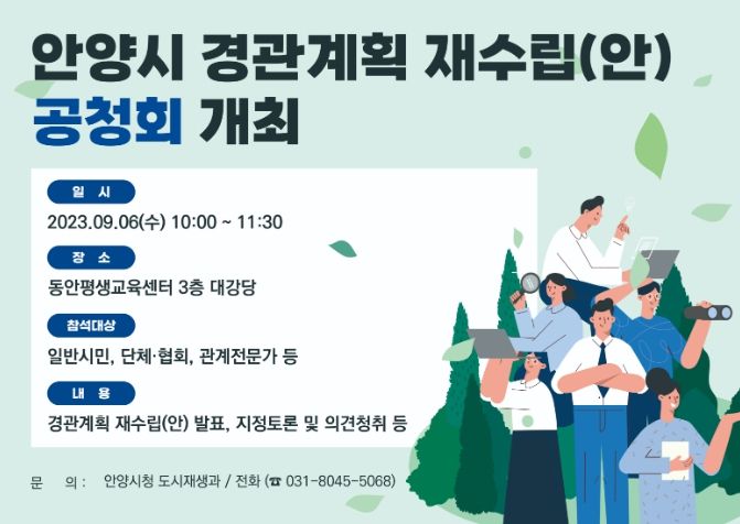 [경기탑뉴스=박봉석 기자] 안양시는 경관계획 재수립을 위한 공청회를 오는 9월 6일 오전 10시 동안구에 있는 평생교육원 3층 강당에서 개최한다고 28일 밝혔다.