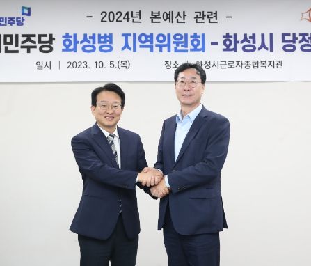 [경기탑뉴스=박봉석 기자] 권칠승 더불어민주당 화성병 지역위원장과 정명근 화성시장을 비롯한 도의원, 시의원, 관계 공무원은 5일 화성시근로자종합복지관에서 당정협의회를 실시했다.