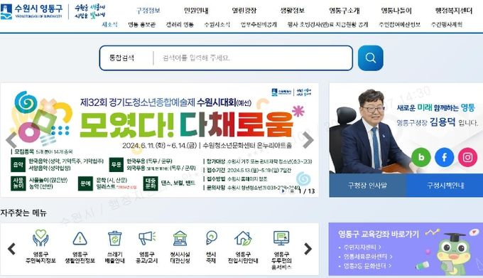 [경기탑뉴스=박봉석 기자] 수원시 영통구는 20일부터 주민들이 더 편리하게 구청 홈페이지를 이용하고 쉽게 정보를 알아볼 수 있도록 영통구 홈페이지 메인 디자인을 개편했다.