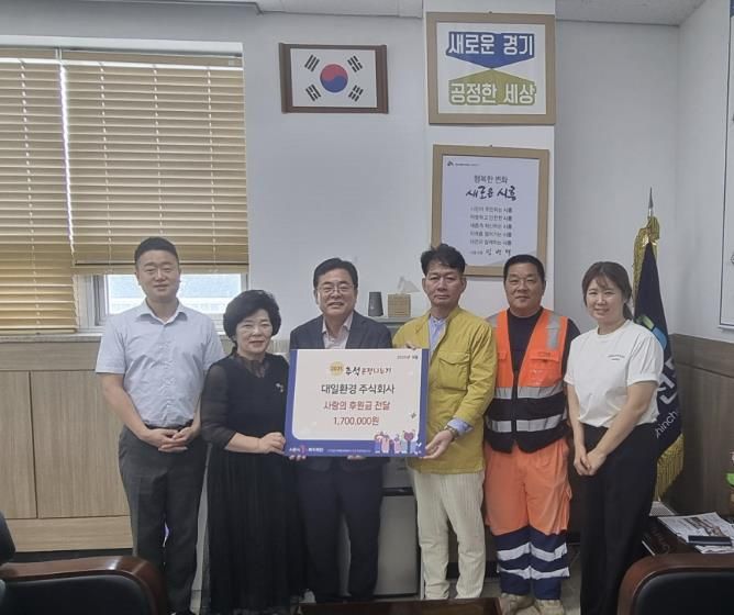 [경기탑뉴스=박봉석 기자] ㈜대일환경은 민족 최대 명절인 추석을 맞아 지역 내 소외된 이웃을 위해 지난 9월 18일 신천동 행정복지센터(동장 신화철)에 후원금 170만 원을 전달했다.