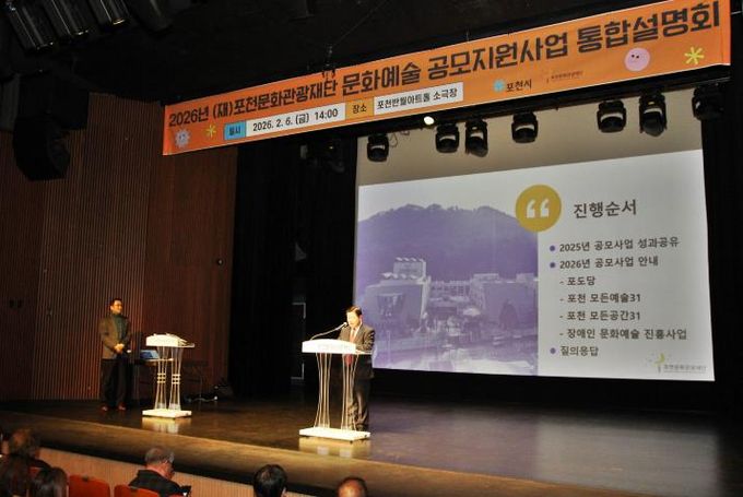 [경기탑뉴스=한진선 기자] 포천문화관광재단은 지난 6일 포천반월아트홀 소극장에서 ‘2026년 문화예술 공모지원사업 통합설명회’를 개최했다.