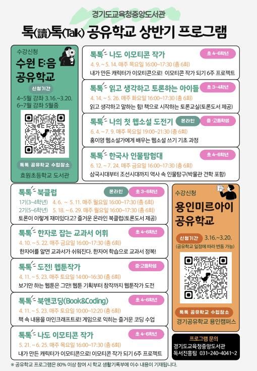 [경기탑뉴스=박봉석 기자] 경기도교육청중앙도서관이 학생들의 창의적 사고력과 진로설계 역량을 강화하기 위해 4월부터 7월까지 녪년 상반기 톡(讀)톡(talk) 공유학교’를 운영한다.