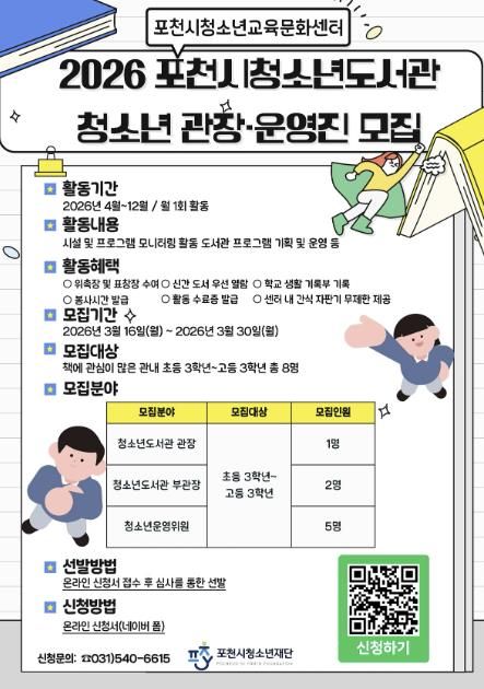 [경기탑뉴스=한진선 기자] 포천시청소년재단 포천시청소년교육문화센터는 청소년 참여형 도서관 운영을 위해 ‘2026년 포천시청소년도서관 청소년 관장 및 운영진’을 모집한다.