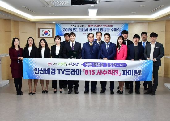 드라마 ‘815 사수작전’이 안산시청 내에서 촬영된 가운데 윤 시장은 이날 드라마 속 주인공이 5년 만에 공무원 시험에 합격해 안산시장으로부터 임용장을 받는 꿈속 상상장면에 카메오로 등장해 실감나고 생생한 연기를 선보였다.