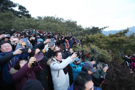 자녀와 함께 또는 동호회 및 직장동료끼리 비봉산 정상을 찾은 이들은 붉은 태양이 떠오르자 “우와” 하는 탄성을 자아내며 스마트폰으로 그 모습을 담기에 여념이 없었다.