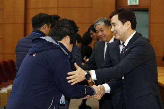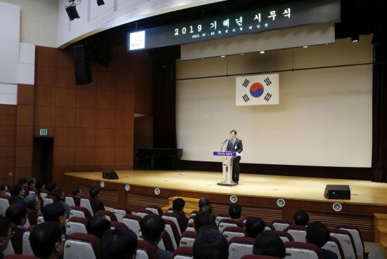 (사진) 2019년 시무식에서 "함께 잘살수 있는 바른 성장 준비 할것을 직원들에게 강조하고 있다