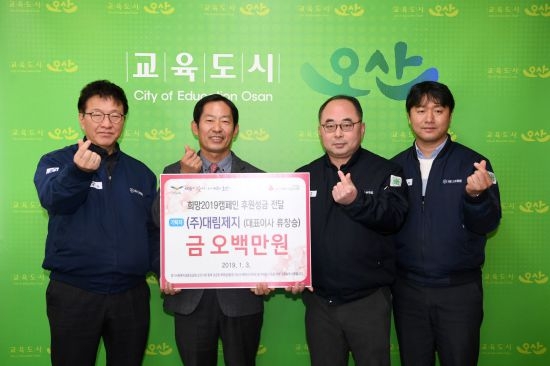 오산시(시장 곽상욱)는 지난 3일 ㈜대림제지(대표이사 류창승)에서 2019년 새해를 맞아 지역사회 내 경제적 어려움이 큰 소외계층을 위하여 후원금 5백만원을 전달하였다고 밝혔다.