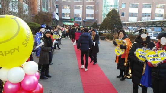 3일 궁내동 주민센터의 직원들과 동 지역사회보장협의체 ‘참사랑’ 위원들은 산본공업고등학교(이하 산본공고) 교문 앞에 빨간 레드카펫을 깔고, 340인분의 음식을 준비한 채 등교하는 학생들을 맞이했다.