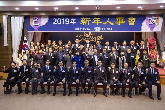 2019 의왕상공회의소 신년인사회가 4일 의왕시청 대회의실에서 열린 가운데 김상돈 의왕시장, 신창현 국회의원, 윤미근 시의회의장 및 시·도의원, 김철환 의왕상공회의소 회장, 경기도 박신환 경제노동실장, 기업체 대표 등이 참석해 파이팅을 외치고 있다.