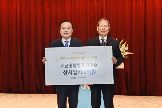 시는 2년 연속 최우수시로 선정되는 쾌거와 함께 받게 된 상사업비 5억원 중 2억원을 양주시희망장학재단의 다양한 장학사업이 내실 있게 확대되기를 바라는 전 직원의 뜻을 모아 기부를 진행했다.