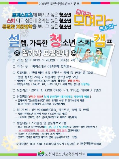 스키캠프 참가대상은 관내 예비 초등4학년부터 중등1학년 청소년 (2006년 1월 1일생부터 2009년 12월 31일생까지)으로 오는 1월 7일 9시부터 11일 18시까지 포천시 청소년 교육문화센터 홈페이지에서 온라인 선착순 모집한다. 참가비는 1인 90,000원이며, 특별지원(관내 저소득층) 청소년에게는 전액 무료로 지원한다.