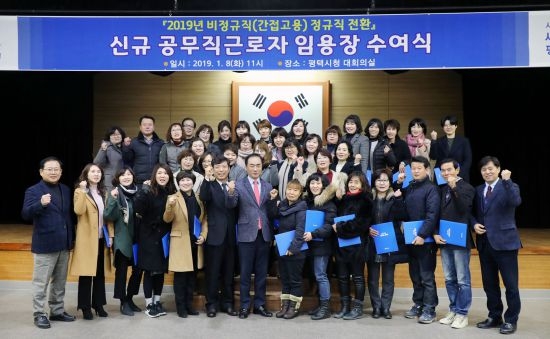 정 시장은 임용장 수여식에서 “2019년 새해에 정규직으로 전환 된 것을 축하하고, 현업에서 일하시는 만큼 건강과 안전에 유의하면서, 시민에게 봉사하는 마음으로 근무를 해줄 것을 당부드린다”며 “앞으로도 지속적으로 고용안정과 근로여건 개선을 위해 최선을 다하겠다”고 말했다.../박봉석기자