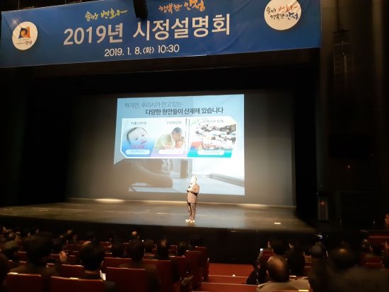 8일 오전 안성시 발화대 길에 위치한 안성맞춤아트홀 대공연장에서 개최된 ‘2019 안성시 시정설명회’에서 우석제 안성시장이 침체되어 있는 안성시의 변화를 위해 던진 말이다.