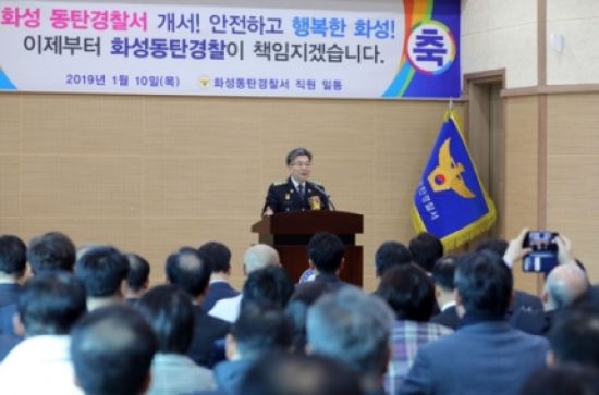 화성동탄경찰서가 10일 오전 동탄경찰서 5층 대강당에서 허경렬 경기남부경찰청장, 서철모 화성시장,김홍성 시의회의장,이원욱 국회의원 및 다수의 기관장 등 지역 주민 약300여명이 참석한 가운데 개서식을 가졌다.