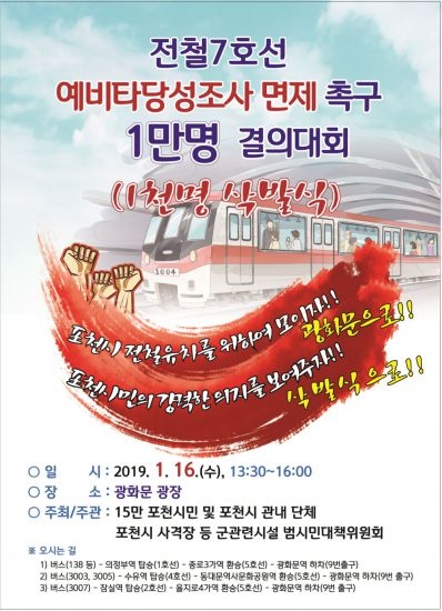 포천시(시장 박윤국)는 오는 16일 수요일 서울 광화문 광장에서 ‘전철 7호선 예비타당성조사 면제 촉구 1만 명 결의대회’를 진행한다고 밝혔다.