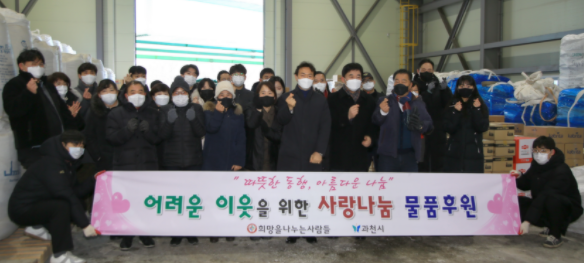 지난 5일에는 과천시보건소 선별진료소 근무 인력을 위해 생수 4,480병을 기부했으며, 지난해 12월에는 대규모 비닐하우스 주거단지인 꿀벌마을에 연탄 3,000장을 후원한 바 있다.