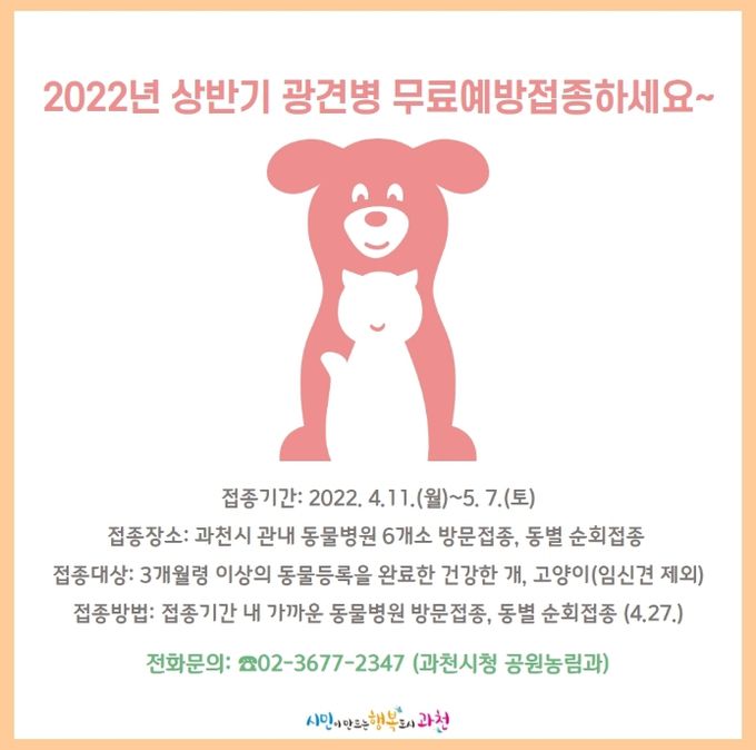 [경기탑뉴스=박봉석 기자] 과천시가 4월 11일부터 5월 7일까지 4주간 반려동물 광견병 예방접종을 실시한다고 밝혔다.