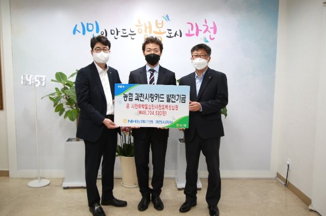 시청 시장실에서 열린 기금전달식에는 김종천 과천시장과 이택선 NH농협은행 과천시 부지부장, 이상훈 NH농협은행 과천시청 출장소장이 참석했다.