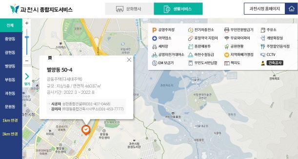 [경기탑뉴스=박봉석 기자] 과천시가 실시간으로 관내 건축공사 현장 위치와 관련 정보를 확인할 수 있는 ‘건축공사 위치 알림 서비스’를 5월 2일부터 시작한다고 밝혔다.