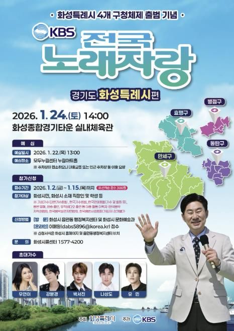 [경기탑뉴스=박봉석 기자] 화성특례시는 다음 달 2일부터 15일까지 ‘KBS 전국노래자랑’ 화성특례시편 참가자를 모집한다고 24일 밝혔다.