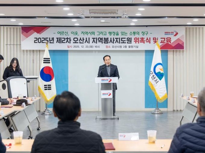 [경기탑뉴스=박봉석 기자] 오산시는 지난 23일 오산시청 물향기실에서 신규 경로당 회장을 대상으로 한 '2025년 지역봉사지도원 위촉식'을 개최했다고 밝혔다.