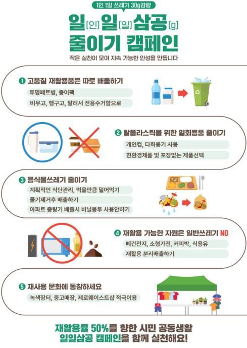 [경기탑뉴스=박봉석 기자] 안성시는 시민의 자발적인 실천을 통해 재활용률을 높이고 생활쓰레기 발생량을 줄이기 위한 ‘1인 1일 쓰레기 30그램 줄이기(일일삼공) 캠페인’을 적극 추진하고 있다고 밝혔다.