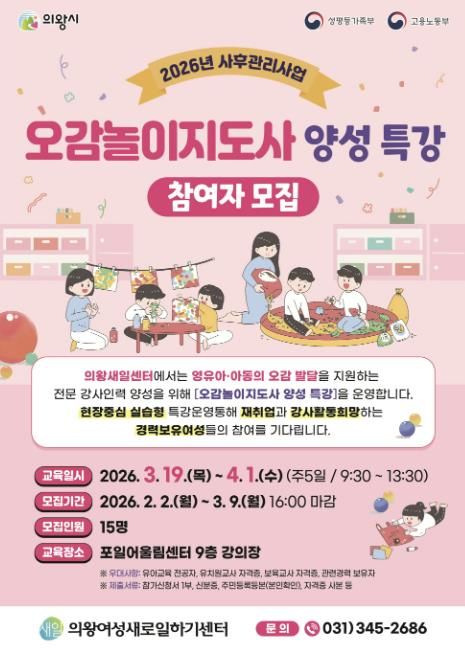 [경기탑뉴스=박봉석 기자] 의왕시 여성새로일하기센터가 '오감놀이지도사 양성 특강'의 교육생을 모집한다.