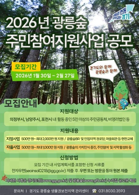 [경기탑뉴스=박봉석 기자] 경기도가 광릉숲 생물권보전지역 활성화를 위해 2026년 광릉숲 주민참여지원사업 참여자를 모집한다.