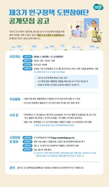 [경기탑뉴스=박봉석 기자] 경기도가 정책 대상자가 직접 정책개선에 참여하는 ‘제3기 인구정책 도민참여단’ 100명을 공개 모집한다.