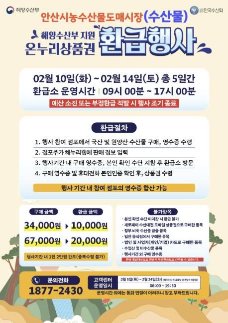 [경기탑뉴스=박봉석 기자] 안산시는 설 명절을 맞아 국산 수산물 소비 촉진과 도매시장 활성화를 위해 오는 10일부터 14일까지 5일간 ‘2026년 설 온누리상품권 환급행사’를 개최한다고 5일 밝혔다.