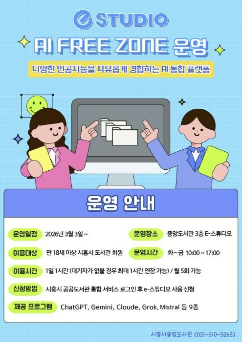 [경기탑뉴스=박봉석 기자] 시흥시중앙도서관은 시민들의 인공지능(AI) 활용 역량 강화를 위해 시 정보통신과와 협업해 도서관 3층 e-스튜디오에 ‘인공지능(AI) 프리 존(Free Zone)’을 구축하고, 오는 3월 3일부터 본격 운영에 들어간다.