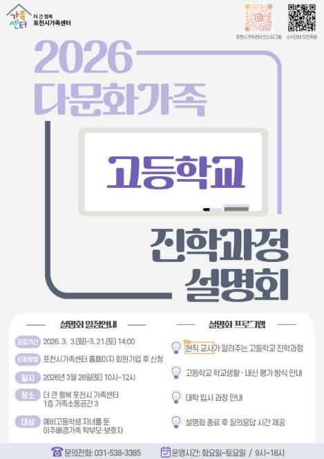 [경기탑뉴스=한진선 기자] 포천시 직영 더 큰 행복 포천시가족센터가 오는 28일, '2026 다문화가족 고등학교 진학과정 설명회'를 개최한다.