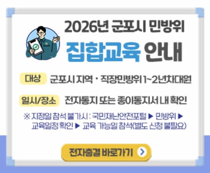[경기탑뉴스=박봉석 기자] 군포시는 민방위대원의 비상 시 대응 역량 강화를 위해 ‘2026년 민방위 기본교육’을 실시한다.