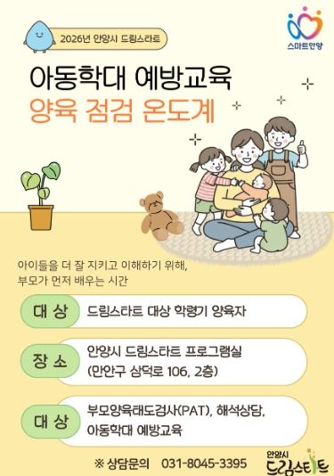 [경기탑뉴스=박봉석 기자] 안양시가 아동 학대를 사전에 차단하고 건강한 양육 환경을 조성하기 위해 맞춤형 부모 교육 프로그램인 ‘2026 드림스타트 양육 점검 온도계’를 본격 가동한다고 18일 밝혔다.