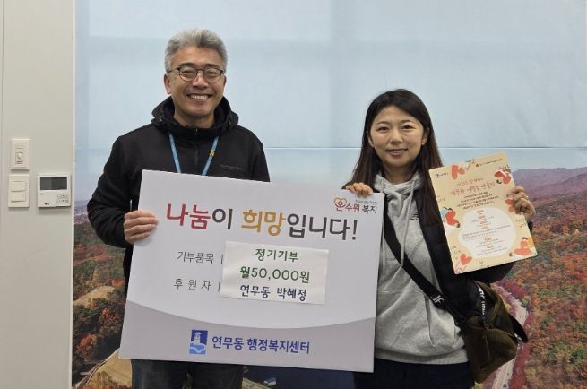 중국 국적의 박혜정님은 지난 15년간 연무동에 거주하며 동네에 대한 깊은 애정을 키워왔다. 그는 “이곳은 나와 우리 가족에게 단순한 타국이 아니라 삶의 터전이자 두 번째 고향”이라며, “그동안 동네에서 받은 따뜻한 이웃의 정을 이제는 어려운 분들에게 나누고 싶어 매월 5만 원의 정기후원을 결심했다”고 전했다.