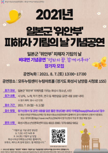 [경기탑뉴스=박봉석 기자] 화성시청소년성문화센터는 오는 8월 14일 일본군 ‘위안부’ 피해자 기림의 날을 맞이하여 비대면 기념 공연을 진행한다.