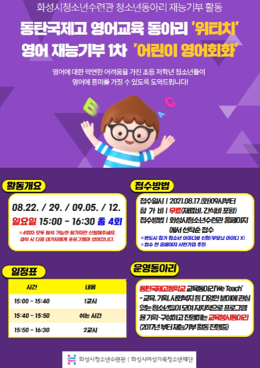 [경기탑뉴스=박봉석 기자] 화성시청소년수련관(화성시여성가족청소년재단 운영)은 청소년 동아리 재능기부활동 ‘어린이 영어회화’에 참가할 초등학교 1~3학년 15명을 오는 8월 17일부터 선착순 모집한다.