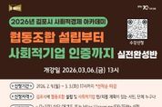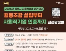 [경기탑뉴스=한진선 기자] 김포시가 사회문제 해결을 위한 참신한 아이디어와 실행력을 갖춘 사회적경제기업 육성을 위해 ‘2026년 김포시 사회적경제 아카데미’를 개설하고, 오는 3월 3일까지 수강생을 모집한다. 이번 아카데미는 평소 사회적경제에 관심 있는 김포시민은 물론, 연내 협동조합 설립과 사회적기업 인증을 준비 중인 관내 기업, 단체라면 누구나 신청할 수 있다. 교육 과정은 ▲사회적기업 개념 및 인·지정 요건 ▲협동조합 개념, 설립 절차 및 인가 요건 ▲2026년 지원제도 등 사회적경제에 대한 기본 개념을 습득하고, 연내 진입을 위한 사전 준비가 가능하도록 실전형으로 구성했다. 특히 전문가 1:1 멘토링을 통해 ▲사업 아이템의 경쟁력 및 지속가능성 진단 ▲정관, 사업계획서 등 필수서류 작성 ▲심사 및 현장실사 대비 전략 등 기업 맞춤형 컨설팅이 후속으로 지원될 예정이다. 수강신청은 3월 3일까지 온라인으로 가능하며, 자세한 사항은 김포시청 홈페이지를 참조하거나 김포시청 지역경제과로 문의하면 된다. 김포시는 ‘일자리창출을 위한 재정지원’을 비롯해 ‘전략모델 개발비’, ‘교육·컨설팅’,