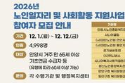[경기탑뉴스=박봉석 기자] 안양시가 1일부터 12일까지 건강하고 활기찬 노후를 위한 ‘2026년 노인일자리 및 사회활동 지원사업’의 참여자 4,998명을 모집한다. 참여자 규모는 유형별로 ▲노인공익활동 3,155명 ▲노인역량활용 1,106명 ▲공동체사업단 574명 ▲취업지원 163명 등이다. 노인일자리사업의 수행기관은 ▲안양시노인종합복지관 ▲비산노인종합복지관 ▲안양시니어클럽 ▲만안·동안노인지회 ▲경기실버포럼 ▲(사)위니버스 ▲시니어복지사회적협동조합 ▲만안구청 ▲동안구청 등 10곳이며, 참여자는 수행기관에서 추진하는 다양한 일자리·사회활동에 참여하게 된다. 신청 자격은 공고일(11월 27일) 기준 안양시에 주민등록이 되어 있는 어르신이다. 세부 기준은 ▲노인공익활동은 65세 이상 기초연금·직역연금 수급자(배우자 포함) ▲노인역량활용은 65세 이상(일부 유형은 60세 이상) ▲공동체사업·취업지원은 60세 이상이다. 다만, 생계급여 수급자(취업지원 제외), 건강보험 직장가입자, 장기요양등급자 등 일부 대상자는 신청이 제한된다. 희망자는 신분증과 주민등록등본 등을 지참하고 해당 수행기관 또는