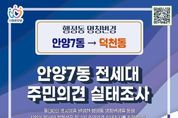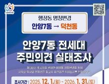 [경기탑뉴스=박봉석 기자] 행정동 명칭 변경 사업을 추진 중인 안양시가 만안구 안양7동의 행정동 명칭 변경을 위해 올해 12월 1일부터 내년 1월 31일까지 해당 동 전 세대를 대상으로 주민의견 실태조사를 실시한다고 1일 밝혔다. 이번 주민의견 실태조사는 안양7동의 행정동 명칭을 ‘덕천동’으로 변경하는 것에 대한 찬반 의견 조사다. 안양7동에 거주하는 전체 세대 중 60% 이상이 참여하고, 참여 세대의 과반수가 찬성할 경우 시는 명칭 변경을 추진할 예정이다. 조사방법은 올해 12월 1일부터 2026년 1월 31일까지 시 홈페이지를 통해 비대면 조사를 진행하고, 12월 18일부터 2026년 1월 31일까지 안양7동 행정동명칭변경추진위원회가 각 세대 방문조사를 병행하게 된다. 덕천(德泉)동은 어린이들이 샘물 솟듯이 씩씩하게 자라서 나라에 큰 일꾼이 되기를 바라는 뜻으로, 큰 덕(德)에 샘 천(泉)을 취해 붙여진 옛 지명이다. 시는 이에 앞서 지난 9월 12일부터 9월 30일까지 안양7동 주민들을 대상으로 행정동 명칭에 대한 선호도 조사를 진행했고, 조사에 참여한 646세대의 주민 중 52.