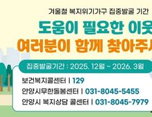 [경기탑뉴스=박봉석 기자] 안양시는 한파와 지속된 경기 침체에 대응해 오는 3월까지 복지서비스 접근이 어려운 취약계층을 적극 발굴하고 지원하는 ‘겨울철 복지위기가구 집중 발굴 기간’을 운영한다고 6일 밝혔다. 이번 집중 발굴은 단전·단수, 실직, 휴폐업 등과 같은 위기 징후가 있는 가구, 고독사 위험이 높은 1인 가구, 저소득 장애인 가구 등이 대상이며, 위기가구를 선제적으로 찾아내고 실질적인 지원을 연계하는 데에 중점을 두고 있다. 시는 안양시무한돌봄센터, 안양시복지콜센터, 각 동 행정복지센터는 물론 명예사회복지공무원, 삼천리 등 민간 협력기관 등과 함께 위기가구를 발굴할 계획이다. 발굴된 위기가구에는 긴급복지 및 기초생활보장제도의 공적서비스를 통한 생계비 및 주거지원, 일상돌봄 지원 등의 맞춤형 복지서비스를 신속하게 제공하고 어려움이 해소될 때까지 사례관리할 계획이다. 특히, 독거노인 등 취약 어르신에게 노인맞춤형돌봄서비스를 안내 및 지원하고, 응급안전안심장비 및 고령자스마트 안심서비스 설치 등을 연계할 계획이다. 시 관계자는 “겨울철은 한파 등으로 대외 활동이 줄어들면서 고립되거나
